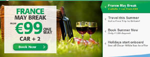 Noticed an ad in the Irish Times 5th May 2011 for Irish Ferries. Take a car and two passengers to France over the May bank holiday half term  €99 euro (or £87 GBP). Found this ad also on their website 10-5-11. Making an enquiry for 2 passengers plus a car going to Dublin 27th May and returning 31st May £345. That is £172 each way. I did upgrade in my dummy booking to Club Class which £16 per person (By some strange coincidence same price as upgrading to Stena Premium so had I not done this one way would cost £140 and this is a shorter journey than going from Ireland to France!